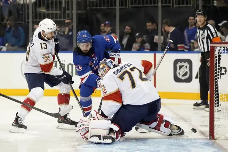 In Game 1 of the Eastern Conference final, Sergei Bobrovsky displayed his goaltending prowess by making 23 saves and earning his first shutout of the postseason. Despite a long stretch without any shots on goal in the middle of the game, Bobrovsky remained composed and stopped every flurry of shots that came his way. Panthers coach Paul Maurice praised the veteran goalie for his ability to make crucial saves and step up in the final minutes of the game. Leading the offensive charge for the Panthers, Matthew Tkachuk contributed a goal and an assist, while Carter Verhaeghe and Sam Bennett also found the back of the net in the team’s 3-0 victory over the New York Rangers.