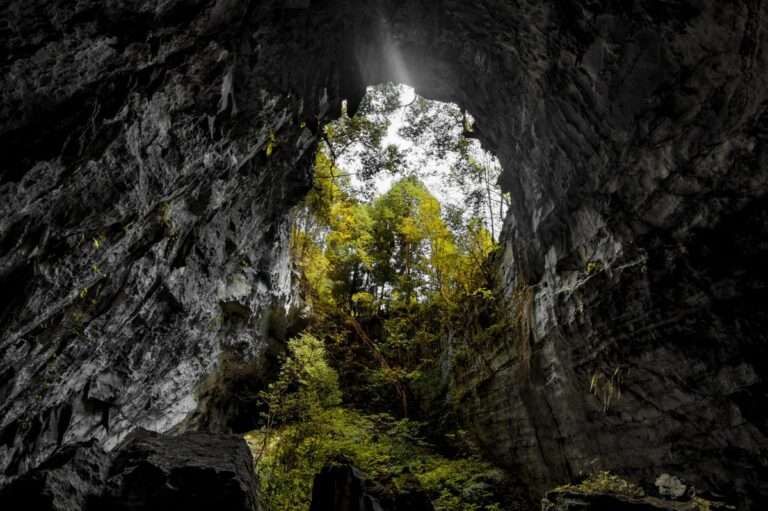 Chuangdong Tiankeng is polygon-shaped and enclosed by six peaks. There is a karst cave on the southwest side that can reach the bottom of the pit, so it is named Chuangdong Tiankeng. Chuangdong Tiankeng is the largest sinkhole in Leye Tiankeng group, belonging to one of the six super large sinkholes in the world. Here set karst cave, underground river, light column and original forest in one, is the best choice for secluence.