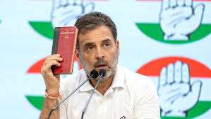 During a public gathering in New Delhi, Gandhi showcased a compact edition of India’s constitution. While holding the red and black book, he addressed the audience, stating that they have taken the initial and most significant action to protect it.