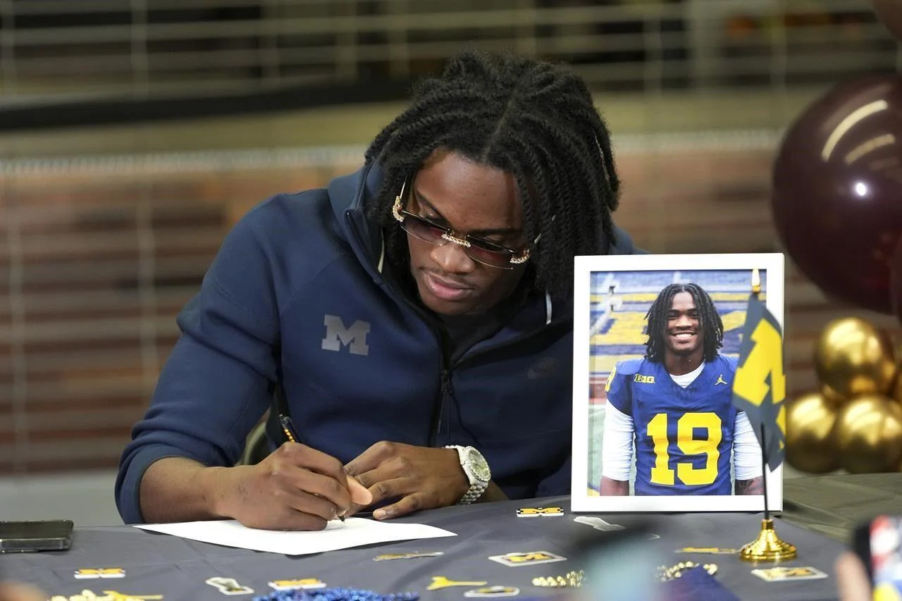 BELLEVILLE, Mich. (AP) — Bryce Underwood, encircled by a slew of reporters and cameras, was relieved to make his commitment to Michigan official with his signature as college football signing day kicked off on Wednesday.