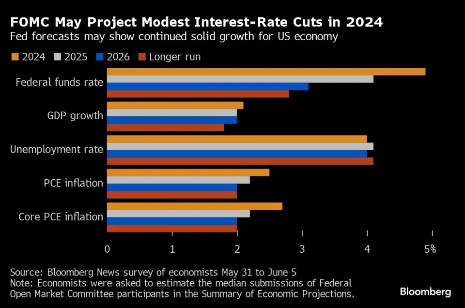 Bloomberg Economics predicts that the new dot plot will indicate two 25-basis-point cuts this year, a decrease from the previous projection of three cuts in March. This adjustment is expected to be supported by the May CPI print, which is likely to show a slowdown in inflation, providing the Federal Reserve with additional reassurance.